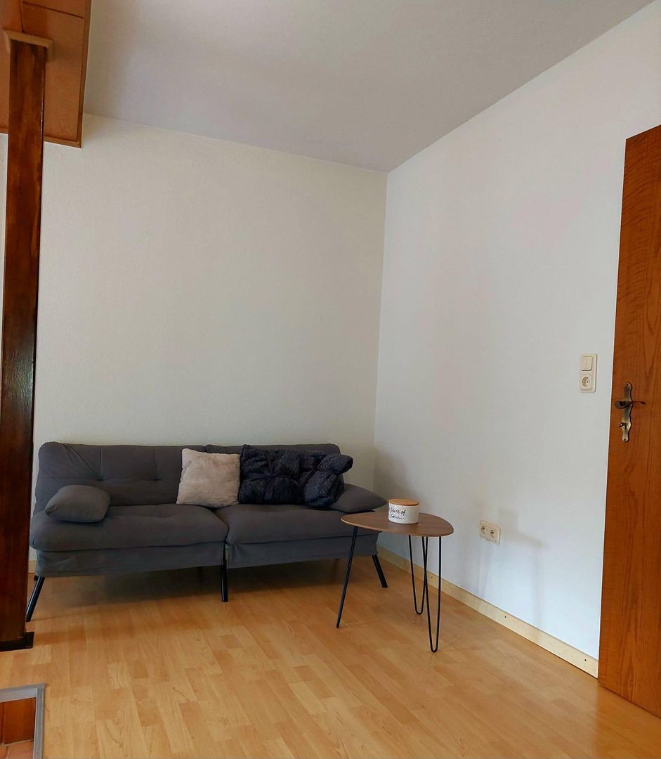 An die Küche anschließendes helles Wohnzimmer mit einladender Couch, TV und Radio.