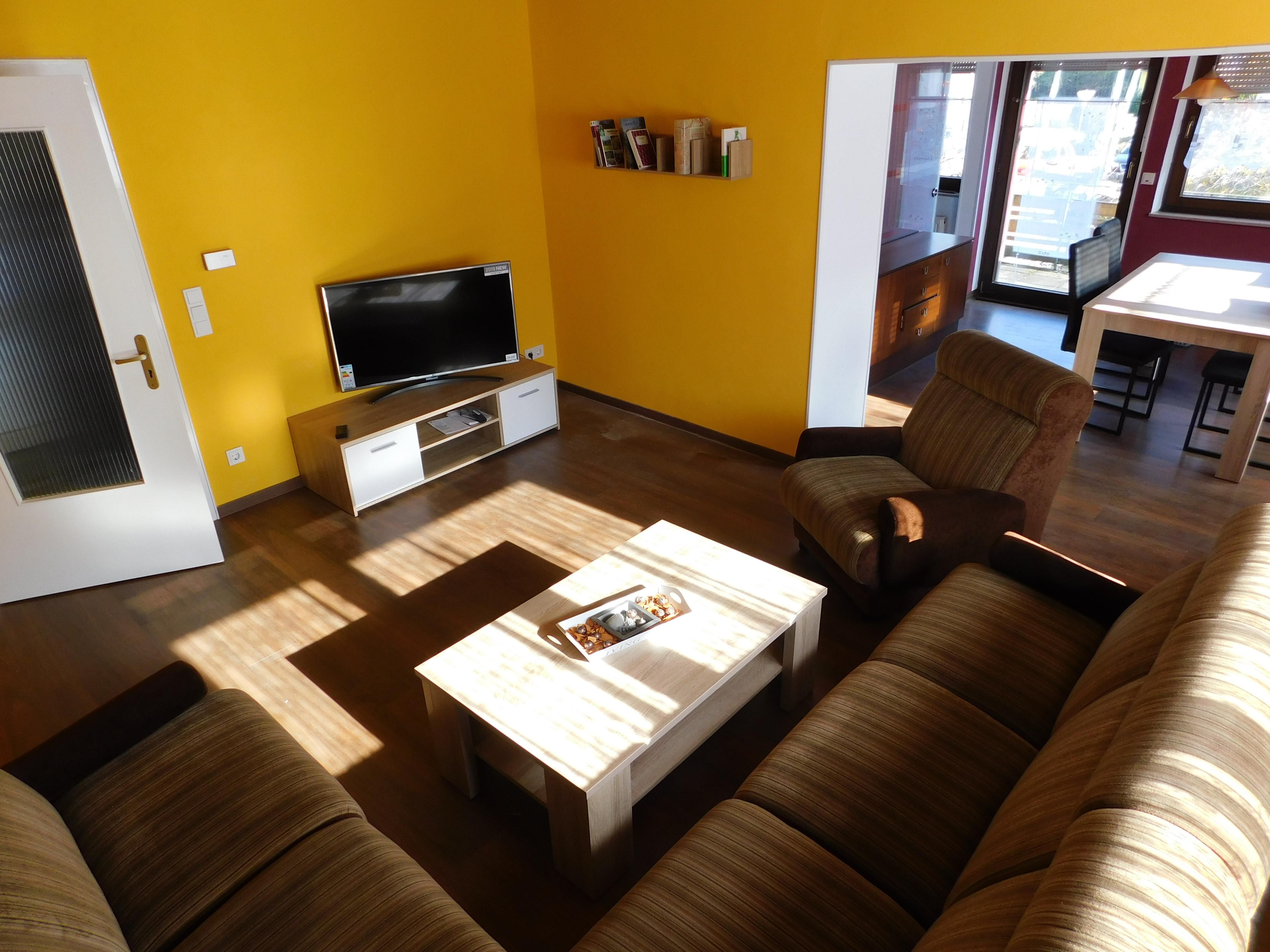 Ferienwohnung mit 2 DZ, 1 EZ, Wohnzimmer, Esszimmer, Küche.