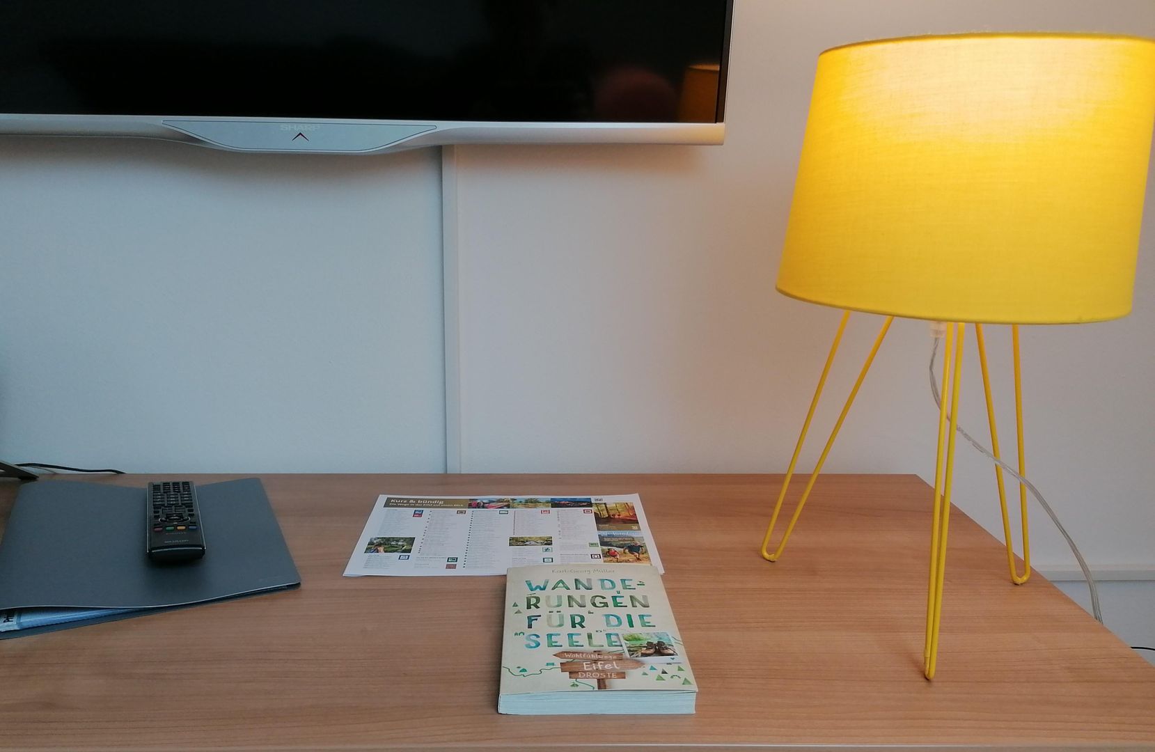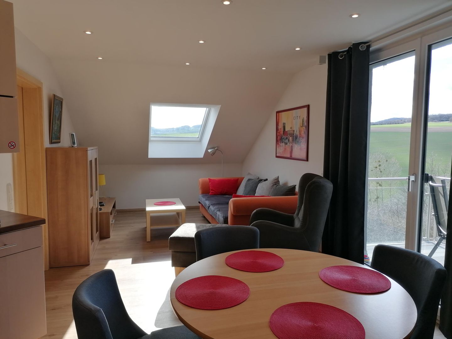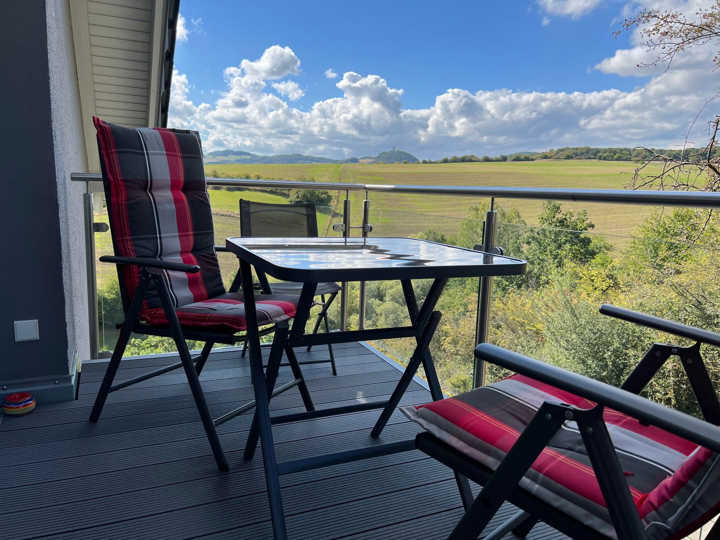 Aus dem Wohnzimmer und von dem Balkon haben Sie einen wunderschönen Ausblick auf die Burg Olbrück und in die Natur.