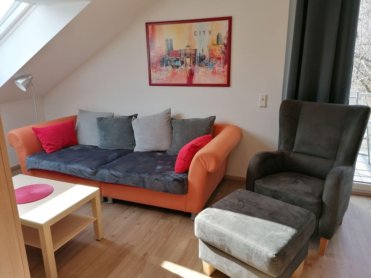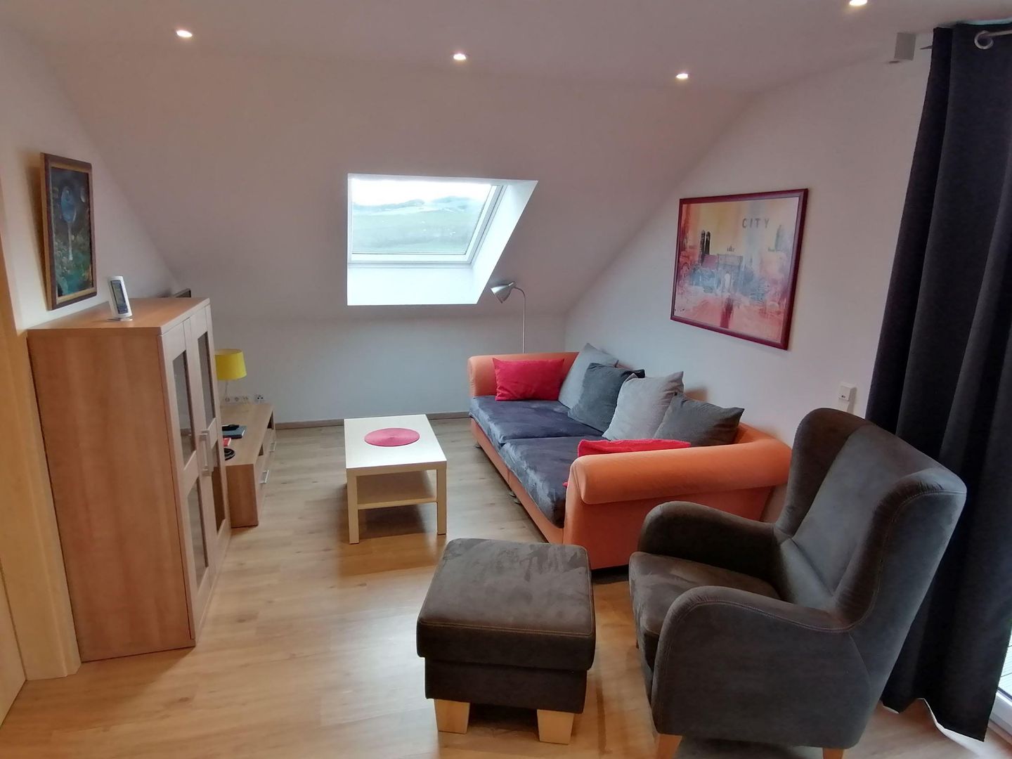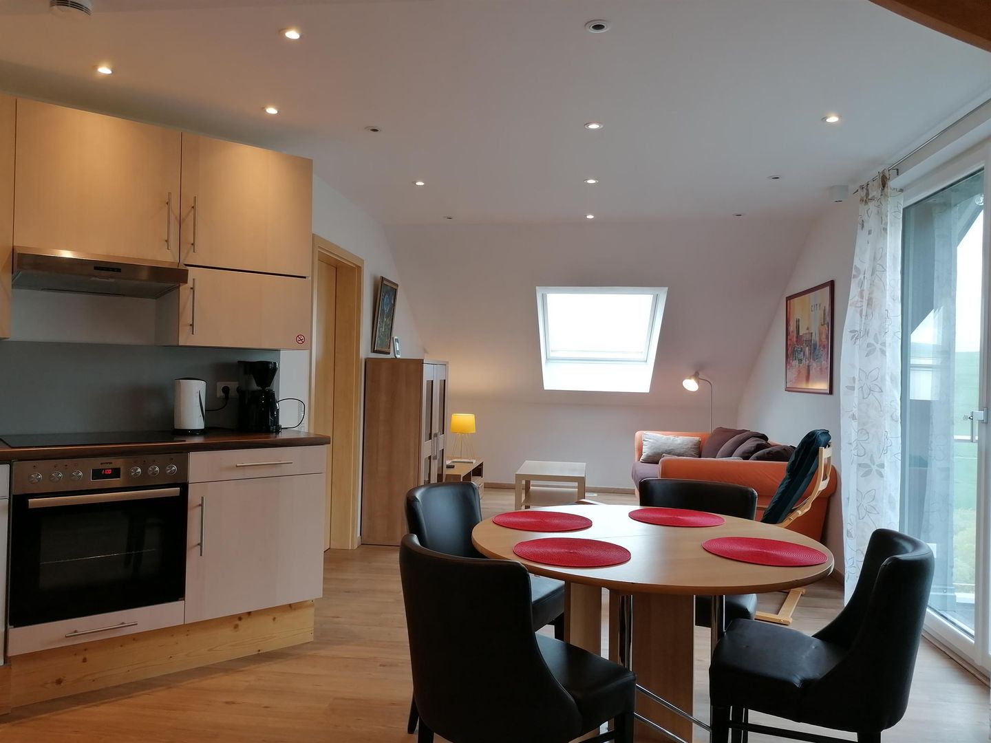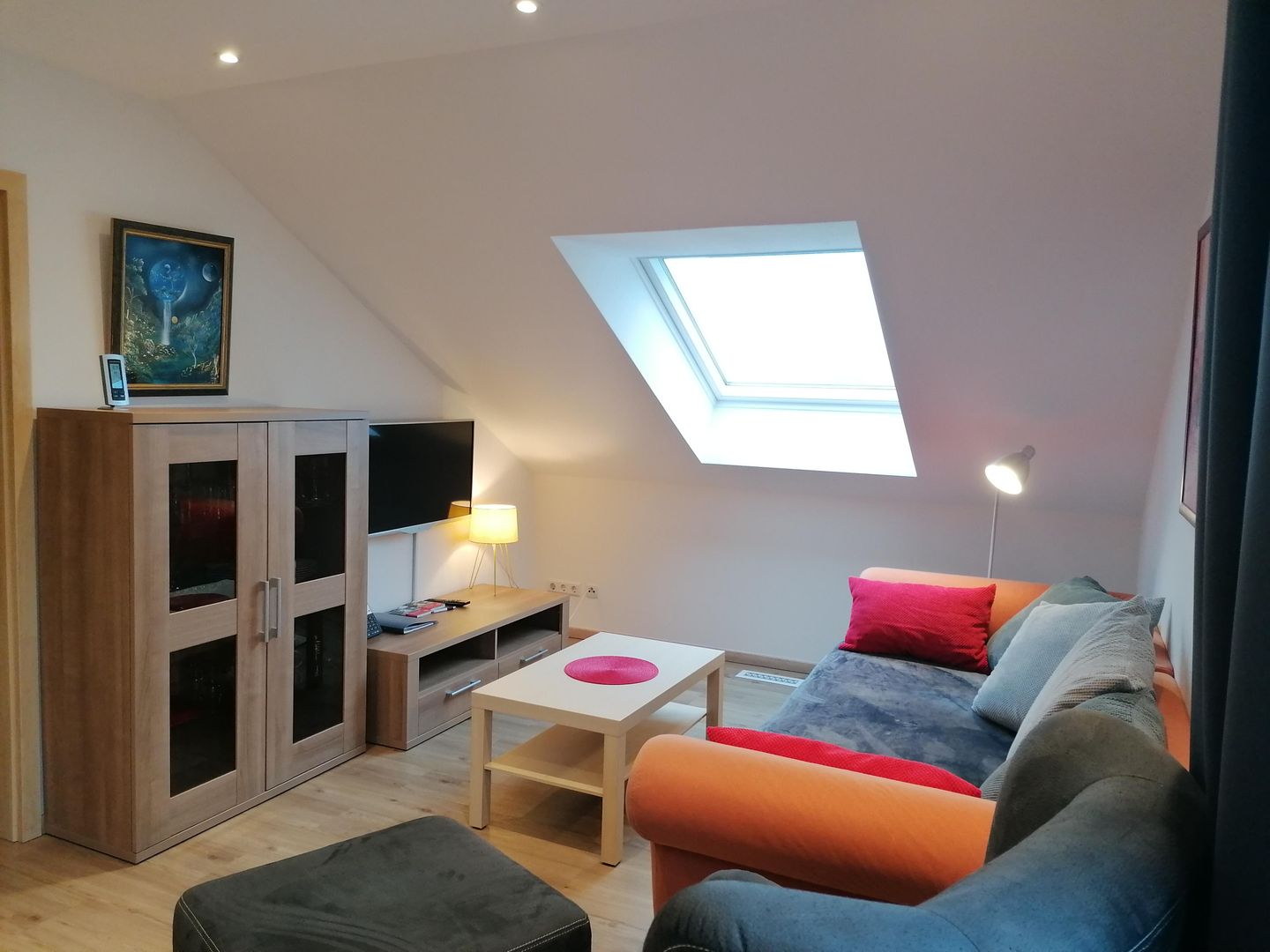 Die Ferienwohnung verfügt über einen offenen Wohnbereich mit einer modern ausgestatteten Küche mit angrenzendem Essbereich und dem Wohnzimmer mit Sat-TV. Es gibt ein separates Schlafzimmer mit Boxspringbett 180x200cm, sowie ein geräumiges Bad mit Dusche und WC. Die Couch im Wohnzimmer kann als zusätzliche Schlafmöglichkeit für eine Person genutzt werden. Ein zweites Schlafzimmer mit einem Doppelbett befindet sich im Dachgeschoss.
