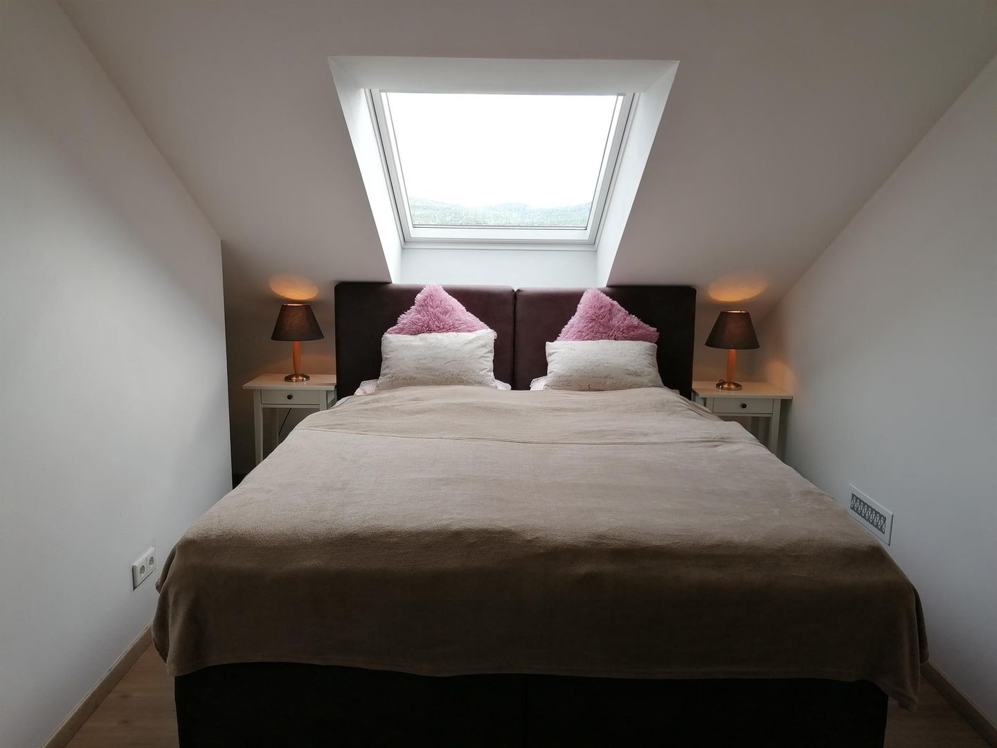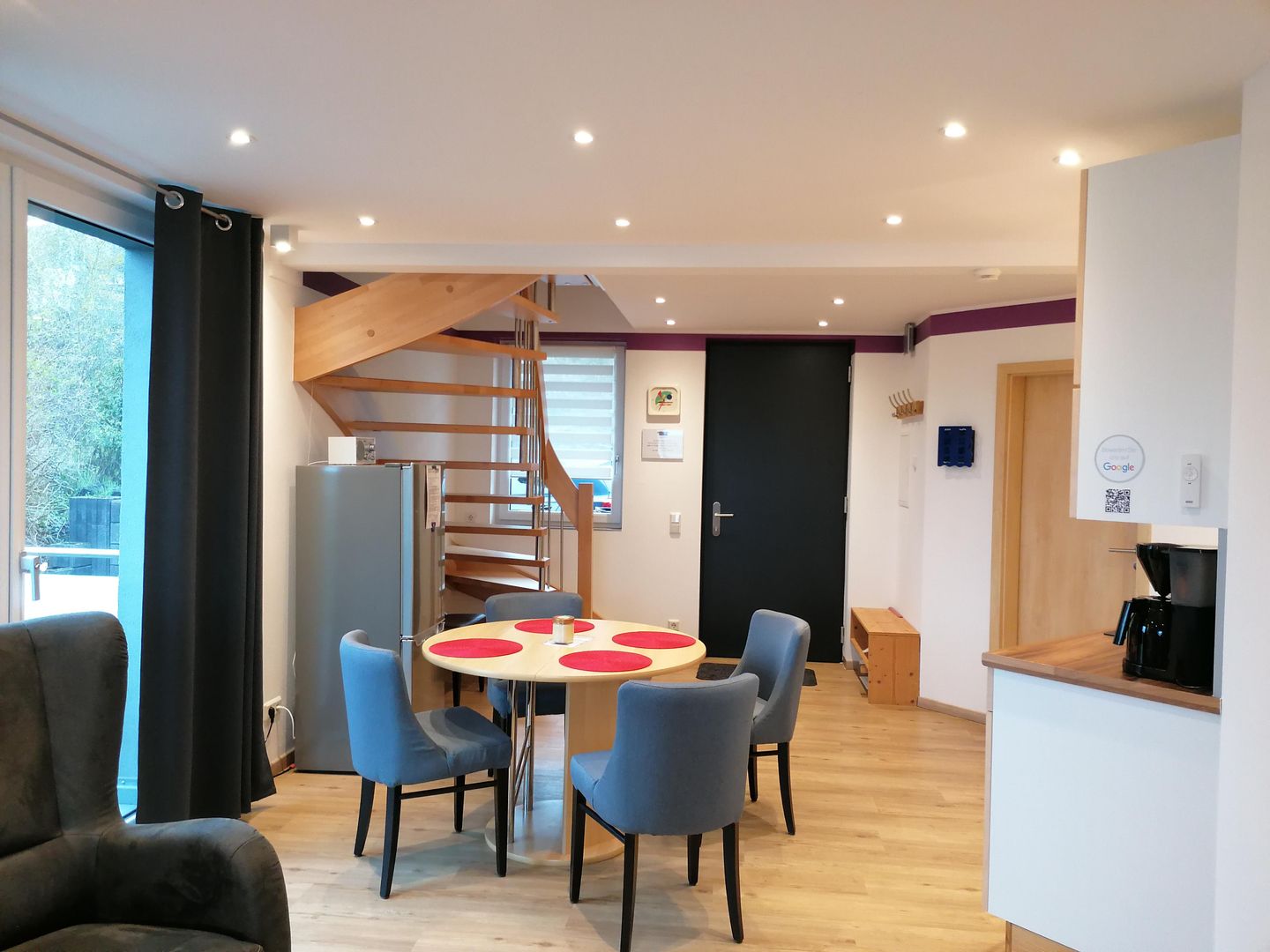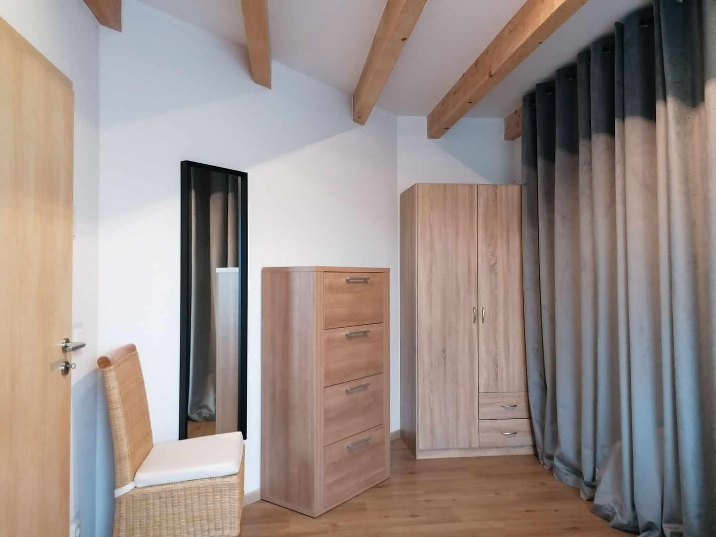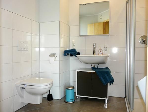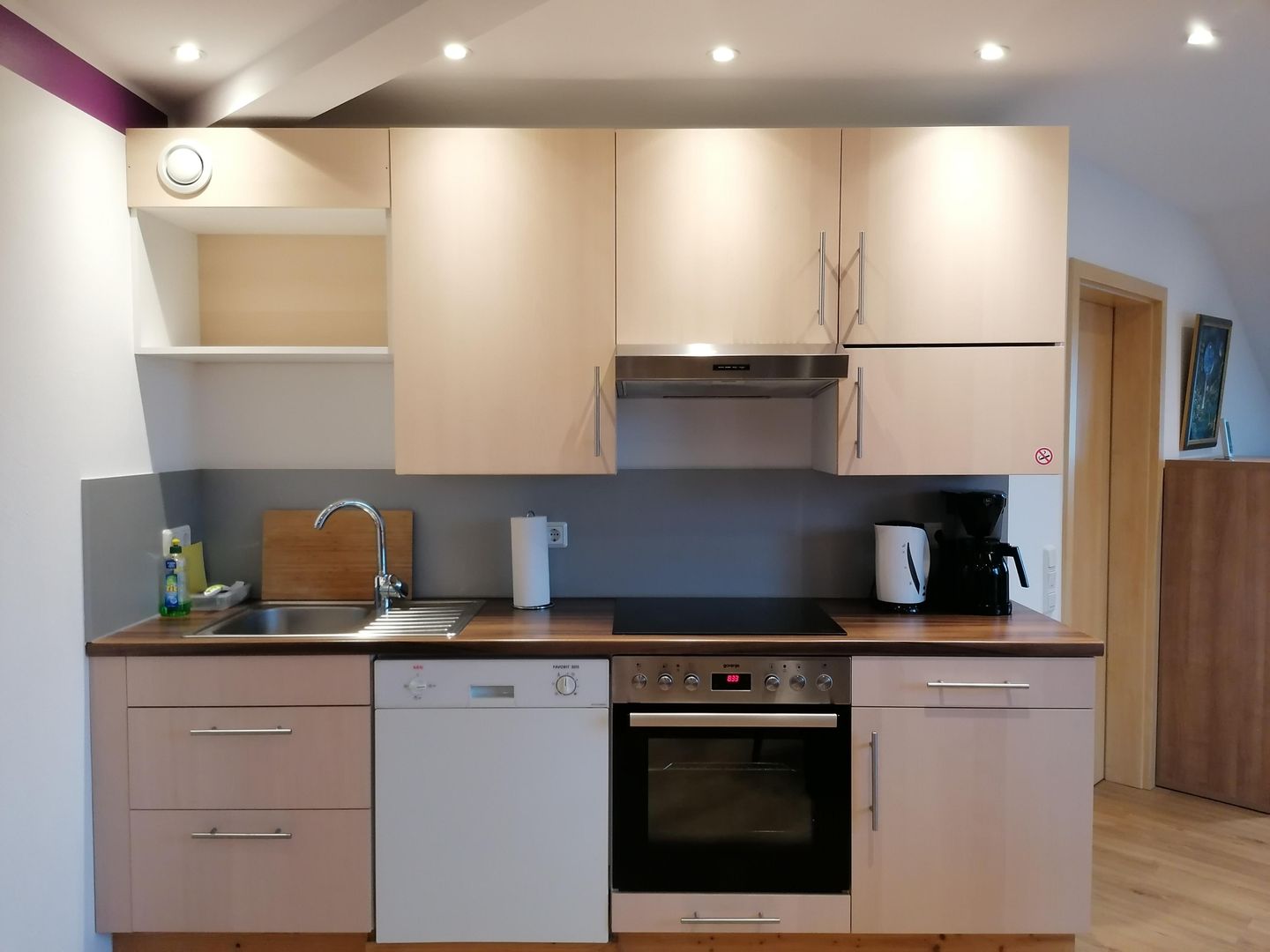 Die Ferienwohnung verfügt über einen offenen Wohnbereich mit einer modern ausgestatteten Küche mit angrenzendem Essbereich und dem Wohnzimmer mit Sat-TV. Es gibt ein separates Schlafzimmer mit Boxspringbett 180x200cm, sowie ein geräumiges Bad mit Dusche und WC. Die Couch im Wohnzimmer kann als zusätzliche Schlafmöglichkeit für eine Person genutzt werden. Ein zweites Schlafzimmer mit einem Doppelbett befindet sich im Dachgeschoss.