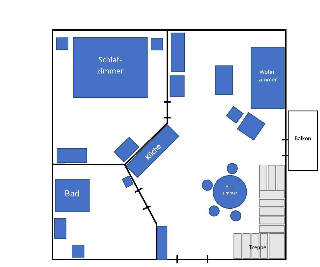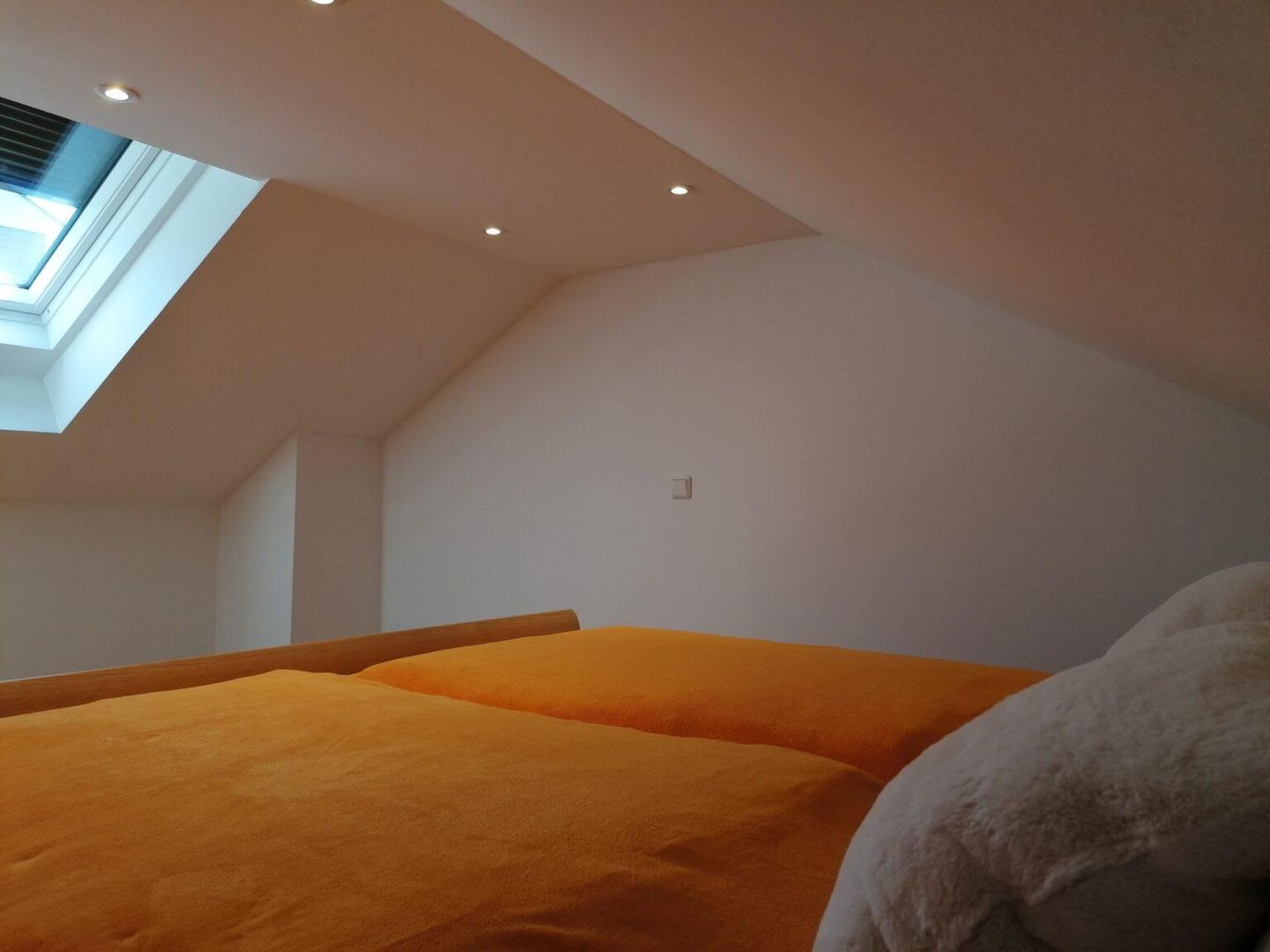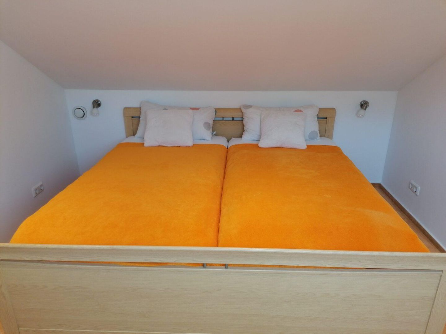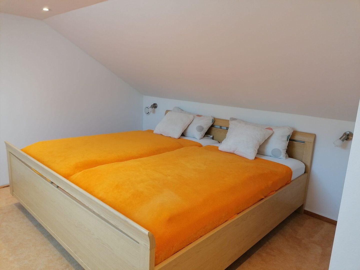 Die Ferienwohnung verfügt über einen offenen Wohnbereich mit einer modern ausgestatteten Küche mit angrenzendem Essbereich und dem Wohnzimmer mit Sat-TV. Es gibt ein separates Schlafzimmer mit Boxspringbett 180x200cm, sowie ein geräumiges Bad mit Dusche und WC. Die Couch im Wohnzimmer kann als zusätzliche Schlafmöglichkeit für eine Person genutzt werden. Ein zweites Schlafzimmer mit einem Doppelbett befindet sich im Dachgeschoss.