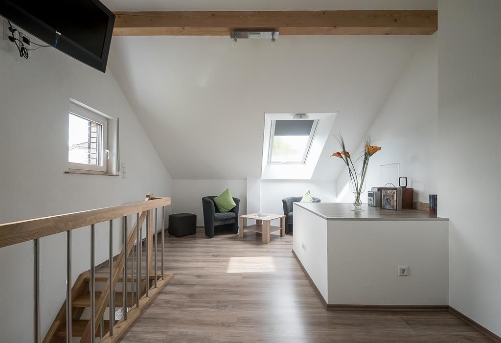 Kombiniertes Studio über 2 Etagen mit Einbauküche mit Sitzgelegenheit und Dusche/WC im unteren Bereich, in der ersten Etage Schlafebene mit französischem Bett, 2 Sessel, Hocker und Tisch sowie Flachbildschirm.