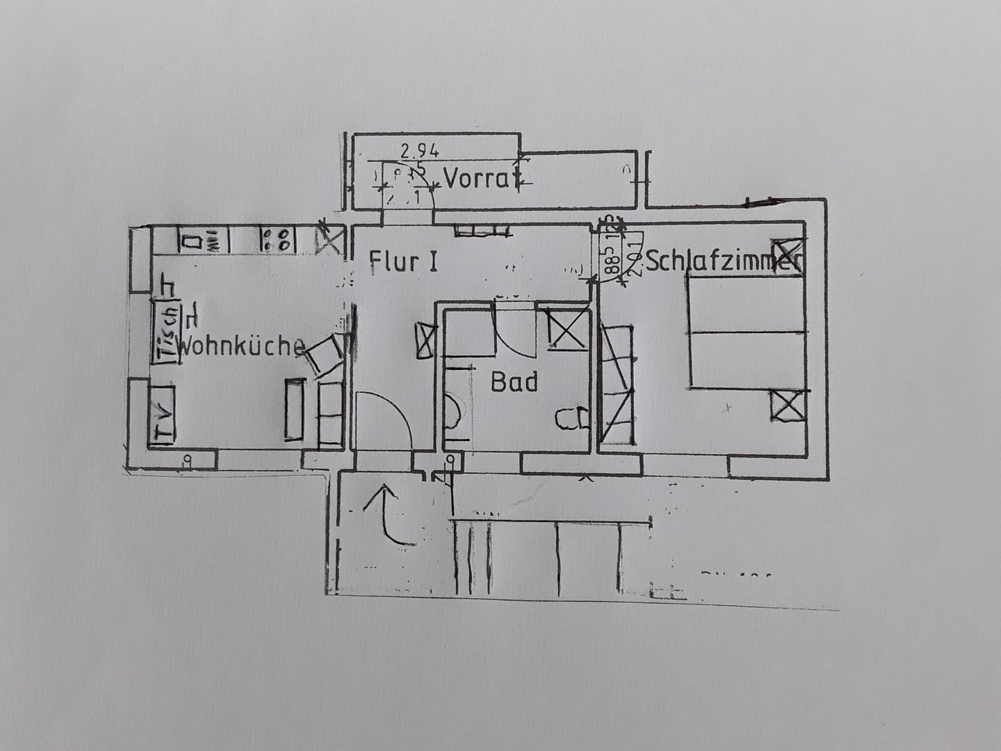 Die Wohnung gliedert sich in Flur, Wohnraum mit Einbauküche und Sat-TV, Schlafzimmer mit Doppelbett je 2x1m, großes Bad mit Dusche und Waschmaschine, Abstellraum.