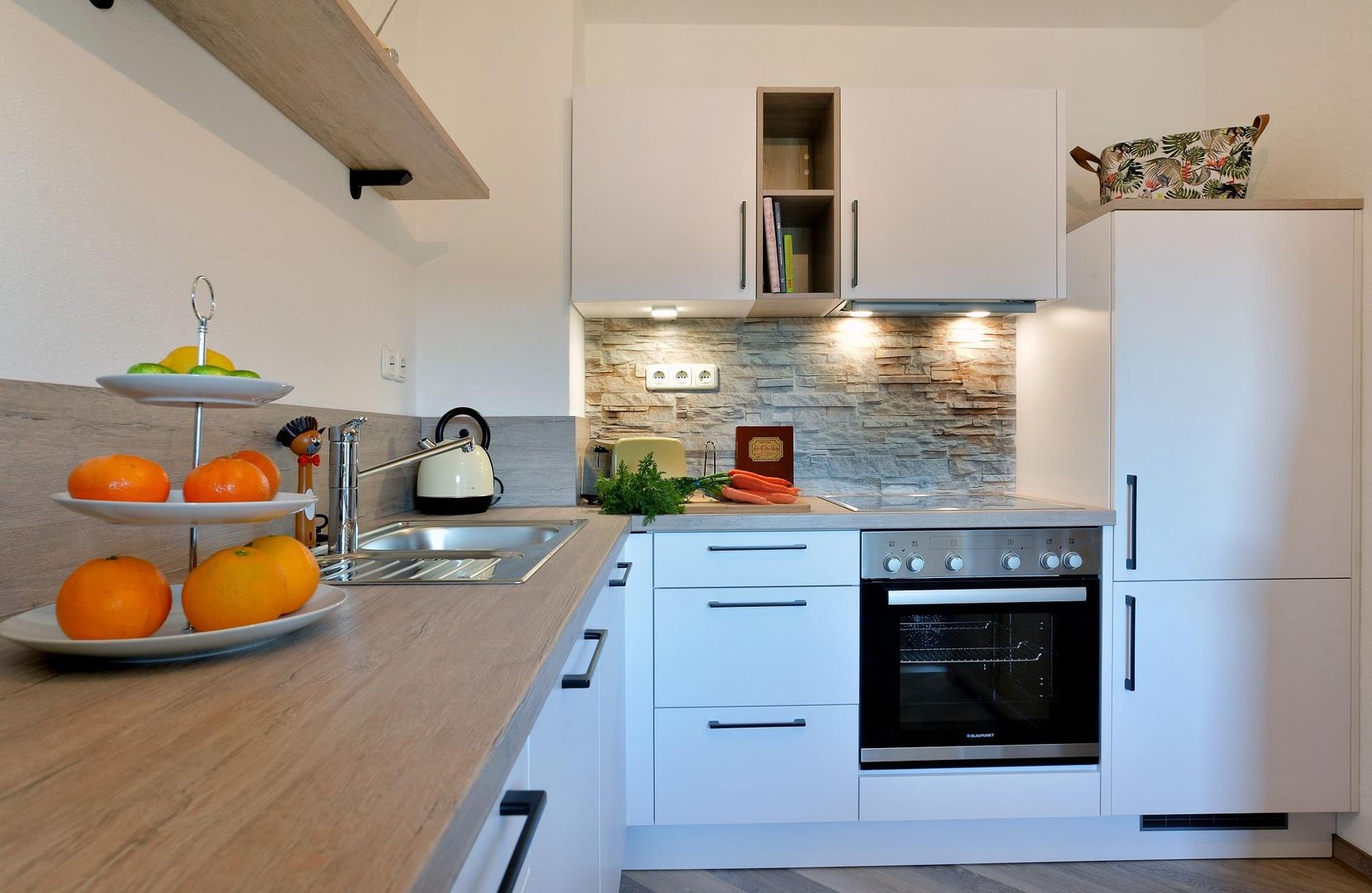Die FEWO verfügt über 2 Zimmer, Küche, Bad und Diele, 60 m². Zusätzlich verfügt sie über eine große Holzveranda mit Sitz- und Liegemöbel und Grill. Die Küche ist neu und modern mit hochwertig eingerichteten Markengeräte einschließlich Spülmaschine, Wasserkocher, Toaster, Herd mit Backofen und Kühlschrank mit Gefrierfach ausgestattet. Das Wohnzimmer verfügt über eine gemütliche Couch mit Longchair. Das Schlafzimmer ist mit Massivholzmöbel ausgestattet.