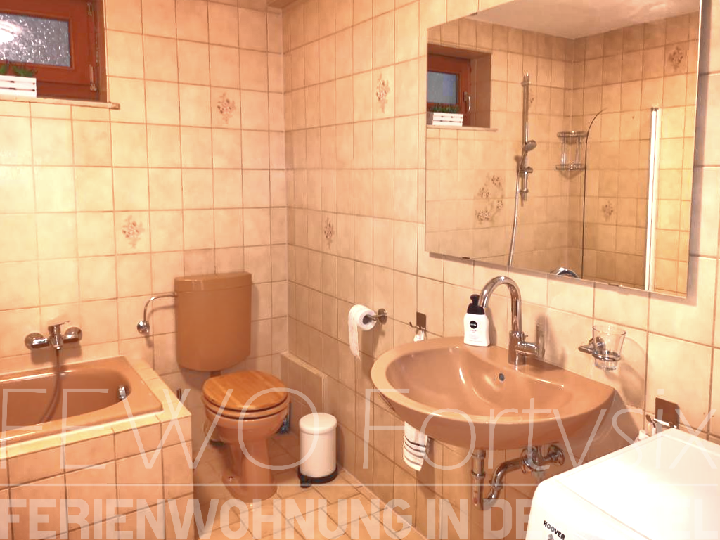 Das Badezimmer ist in warmen Farben gehalten und besitzt eine große Badewanne mit einer Vorrichtung zum Duschen. Außerdem befindet sich im Badezimmer die Waschmaschine.