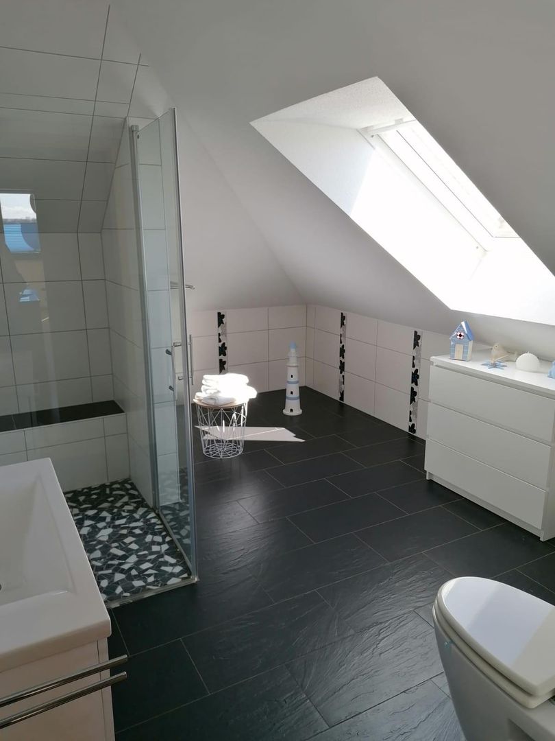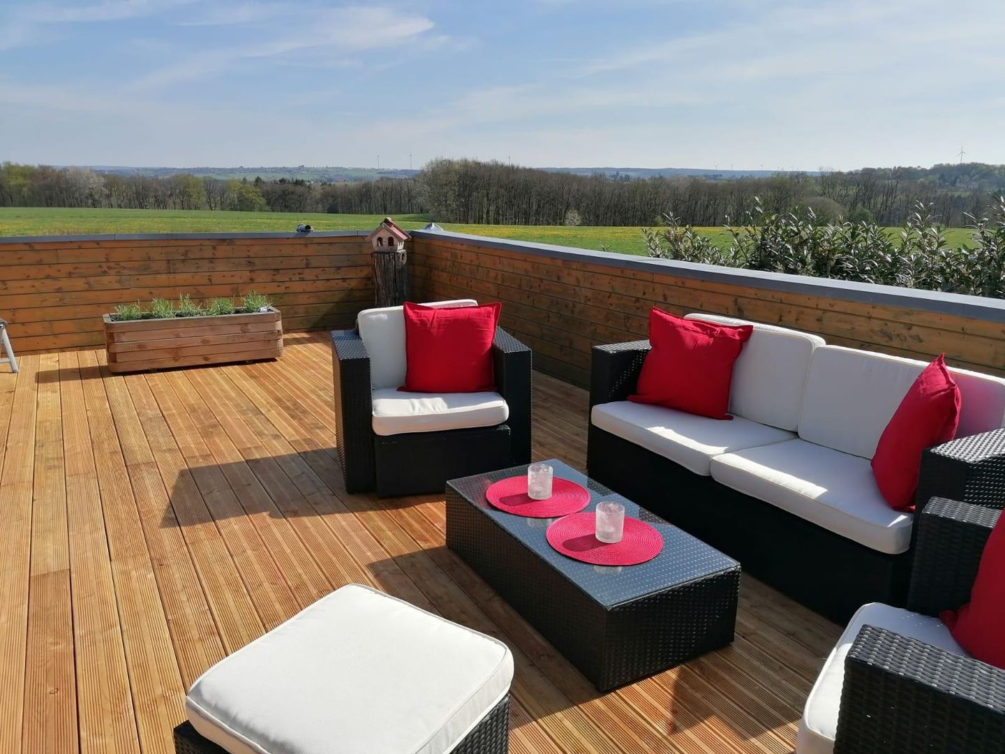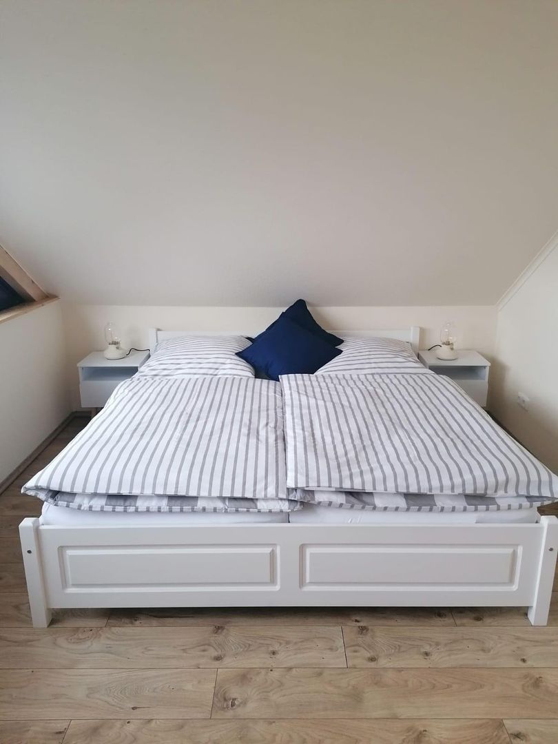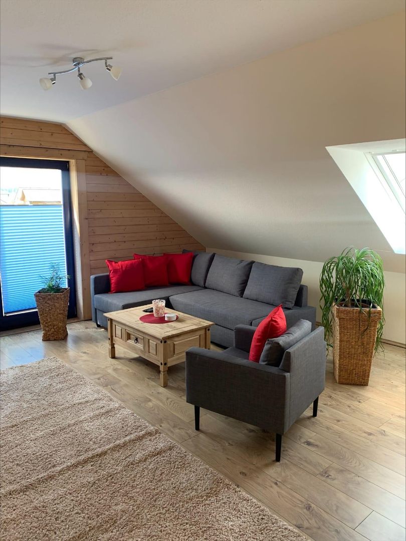 Unsere 80qm große Fewo bietet einen offenen Koch-Ess-Wohnbereich, ein Schlafzimmer, ein Bad, sowie eine 40qm große Sonnenterasse mit herrlichem Ausblick. Im Schlafzimmer befindet sich ein Doppelbett und ein Kinderbett, im Wohnzimmer ein Schlafsofa.