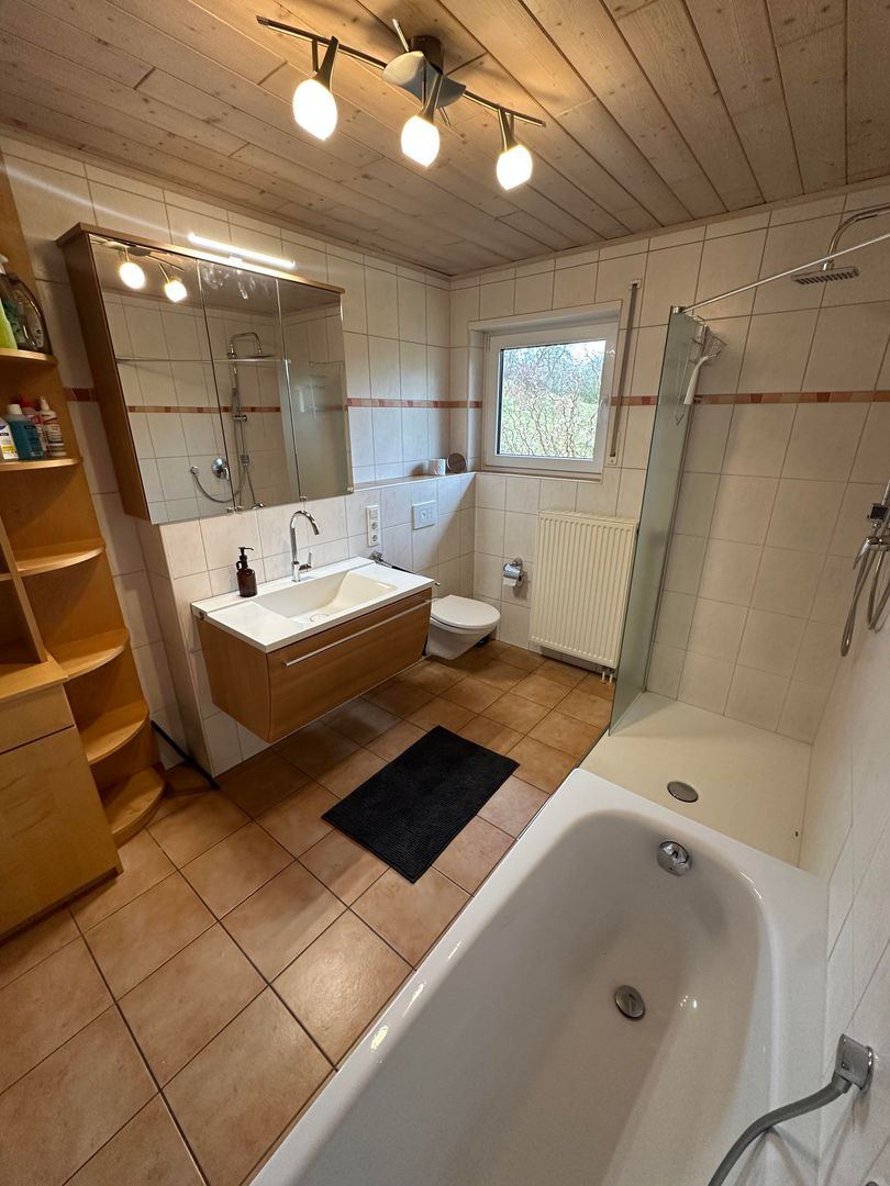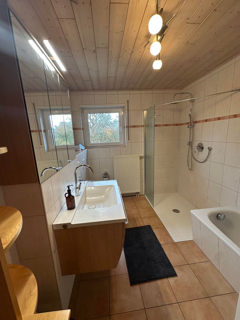 Das barrierefreie Badezimmer verfügt über eine große Dusche, Badewanne, WC. Ein Föhn ist vorhanden.