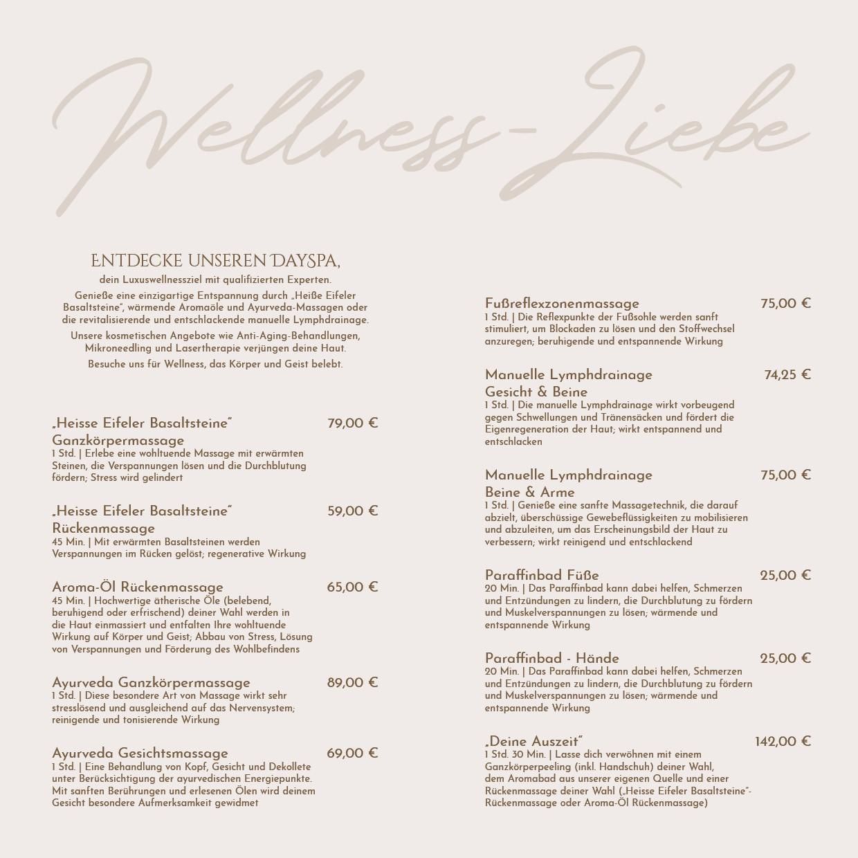 Der Hof lädt mit einer kleinen Parkanlage hinter dem Anwesen zum Verweilen und Entspannen ein. Seit 2024 bieten wir in unserem eigenen DaySpa Relaxanwendungen und Kosmetik für unsere Gäste an. Ab Dezember 2024 werden in der neuen kleinen Vinothek tolle regionale Weine zum Probieren vorgestellt. Eine eigene Vinothek bietet den Gästen die Möglichkeit, eine sorgfältige Auswahl an regionalen Weinen in gemütlicher Atmosphäre zu genießen und sich über die Besonderheiten der Weine aus der Region zu informieren.