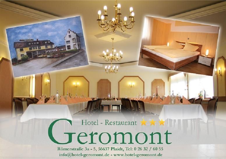 Das Hotel wurde 1978 von dem Ehepaar Doris und Bodo Geromont in Plaidt eröffnet. Seit 01.01.2000 befindet es sich im Besitz des Sohnes Werner Geromont. Unsere Gästezimmer sind behaglich und modern mit Dusche/WC, Telefon und TV ausgestattet. Als besonderen Service bieten wir unseren Gästen kostenlosen Internetzugang per Wireless LAN in allen Zimmern! Frisch gestärkt am reichhaltigen Frühstücksbuffet in den Tag starten und am Abend ein stilvolles Essen zu zweit, mit der Familie oder Geschäftsfreunden genießen. Ob Tagungen, Familienfeier oder Betriebsausflug. Unsere Tagungs- und Restaurationsräume bieten Ihnen immer das passende Ambiente für bis zu 120 Personen.