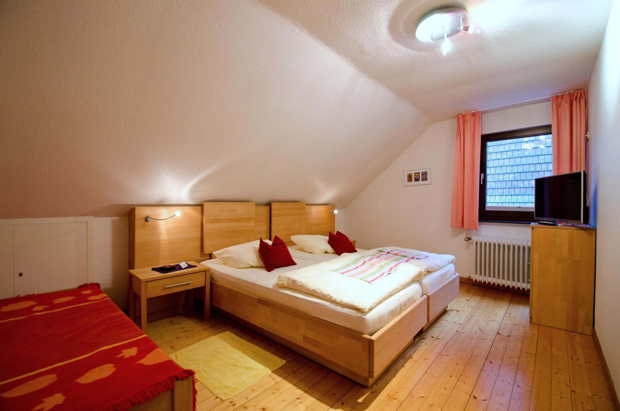 Alle Zimmer sind mit massiven Buchenmöbeln, Holzfußboden, SAT-FarbTV und Radiowecker ausgestattet.
