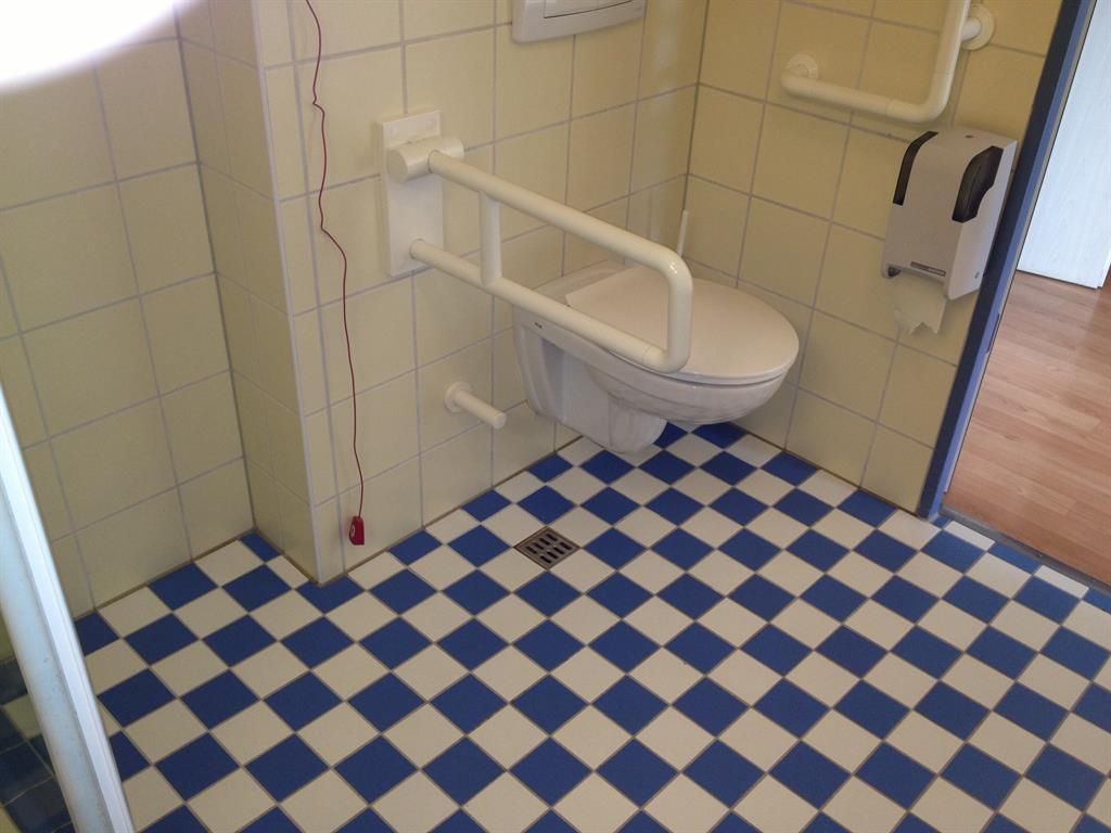 • Ein Badezimmer mit einem WC und Haltegriffen. Der Boden ist mit einem blauen und weißen Schachbrettmuster gefliest.