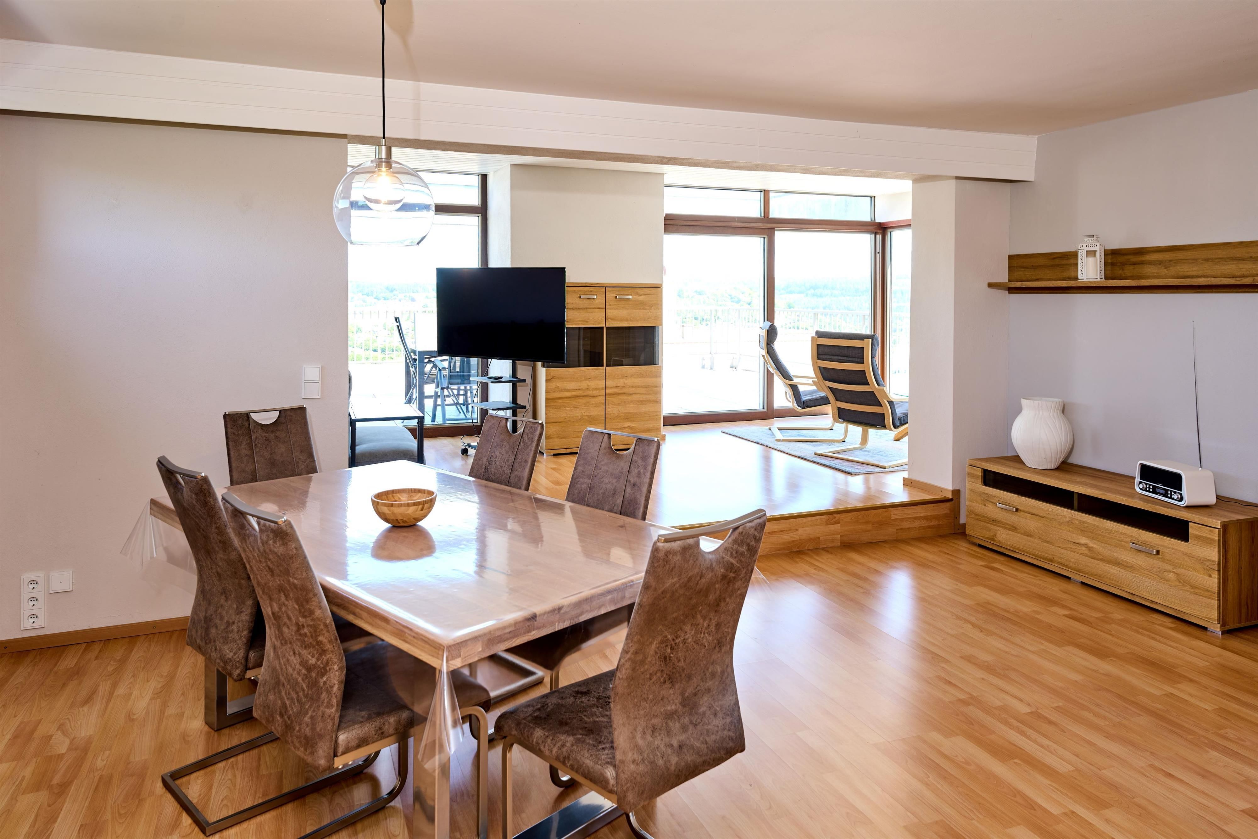 Die Ferienwohnung mit ca. 95 qm Wohnfläche liegt in der obersten 6. Etage eines Mehrfamilienhauses und bietet einen unvergleichbaren Blick auf Daun.