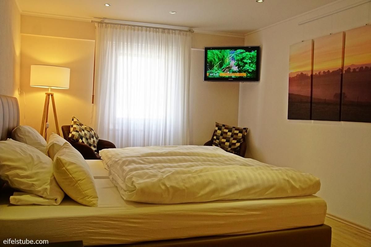 Lichtdurchflutetes und einladendes Ferien-Apartment zum Wohlfühlen mit ca. 90 qm Wohnfläche und individueller Einrichtung, teils mit Antiquitäten ausgestattet. Absolut ruhige Lage im idyllischen Ortsteil Oberlützingen von Burgbrohl (Rheinland-Pfalz, Kreis Ahrweiler): Inmitten der Natur, direkt an Wander- und Spazierwegen des Vulkanparks Brohltal/Laacher See gelegen, liegt in friedlicher Wohngegend des kleinen Dörfchens die verkehrsberuhigte Südstraße. Die Ferienwohnung "Himmel un Ääd" lehnt sich in ihrer Gestaltung an die Farben der Natur (Himmel = Baum, Äpfel & Ääd = Erde, Kartoffeln) und die Einigkeit mit der Region an. Gleichzeitig betont sie durch ihre Farbgebung die Verbundenheit mit südlicheren und mediterranen Regionen. Geräumiger, heller Eingangsbereich mit Garderobe, Sitzbank, Ganzkörperspiegel und kleinem Sekretär, großes Wohn-/Esszimmer in Beige- und Braun-Tönen. Der Wohnraum ist ausgestattet mit einer Schlafcouch (160 x 200 cm), 3 Sesseln, einem ausziehbaren Massivholz-Esstisch und 5 Stühlen (weitere Stühle in der Küche). Ein 55 Zoll-TV mit Satellitenfernsehen und Smart-TV lädt zum Filmabend ein, über die Bluetooth/CD-Stereoanlage hören Sie Musik nach Wunsch. Gesellschaftsspiele und Bücher stellen den weiteren Zeitvertreib sicher. Das große Schlafzimmer „Südtirol“ ist in einem beruhigenden Grün gehalten und bietet ein Doppelbett mit einer Breite von 180 cm, das mit einer bequemen Matratze (und Soft-Topper) ausgestattet ist. Ein antiker Holzschrank sowie eine kleine Kommode bieten ausreichend Stauraum. Im farbenfrohen Schlafzimmer „Burano“ sind zwei Einzelbetten (90 x 200 cm), die auch als Tagesbetten genutzt werden können, untergebracht. Ein hoher Schrank sowie eine Kommode bieten Platz zur Unterbringung des Gepäcks. Ein Zustellbett (ca. 80 x 190 cm) kann bei weiterem Bedarf neben der Aufbettung der Schlafcouch im Wohnzimmer beigestellt werden. Ein Kinder-Reisebett ist vorhanden. In den Schlafzimmern finden Sie ferner einen Radiowecker und ein CD-Player-Radio. Das schnurlose Telefon in der Wohnung kann kostenlos für Anrufe ins deutsche Festnetz unbegrenzt genutzt werden. Zum Balkon mit Sitzgruppe und Tisch sowei einem Sonnenschirm gelangt man sowohl von der Küche wie auch vom Wohn-/Esszimmer aus. Nach Südwesten ausgerichtet, fällt der Blick dort ringsum auf Bäume und Gärten der umliegenden Einfamilienhäuser. Durch die Höhenlage des Ortes sieht man in der Ferne die Hügellandschaft des Vulkanparks. Helles Badezimmer mit Fenster; Toilette, Waschtisch, Schrank, Dusche und separate Badewanne sowie Grundausstattung (Shampoo, Duschgel, Badeschaum, Seife, Toilettenpapier). Ein Gäste-WC mit Handwaschbecken befindet sich ebenfalls in der Wohnung. Handtücher und Bettwäsche werden selbstverständlich gestellt. Vollausgestattete Einbau-Küche in Cafè-Tönen: Spülmaschine, Elektro-Backofen, Ceran-Kochfeld und Dunstabzugshaube (1 Stufe), Mikrowelle, Wasserkocher, Rührgerät, Mixstab, Kaffeemaschine, Nespresso-Maschine (ohne Kapslen), Eisschrank, Esstisch mit 4 Stühlen, Kinderhochstuhl (auf Anfrage) und eine Grundausstattung an Lebensmitteln (Kaffee, Tee, Kakao, Gewürze, Öl, Essig, Küchentücher, Haushaltspapier) findet der Gast ebenfalls vor. Eigener KFZ-Stellplatz unmittelbar neben dem Haus. Alle Räume können vollständig verdunkelt werden (Rollläden). Die Wohnung befindet sich im 1. Obergeschoss eines ruhigen 4-Familien-Wohnhauses mit nur zwei Etagen und ist mit einer Fußbodenheizung ausgestattet. Kinder sind herzlich willkommen, Haustiere sind nach Anmeldung und gegen Gebühr gestattet. Das Rauchen ist ausschließlich auf dem Balkon erlaubt. Die Verständigung mit den Gastgebern ist auf Deutsch, Englisch, Italienisch und Französisch möglich. Alle Geschäfte des täglichen Bedarfs und Restaurants im Hauptort Burgbrohl (3 Minuten mit dem Auto) sowie den umliegenden Ortschaften Niederzissen und Brohl-Lützing. Die nächstgrößere Auswahl, Einzelhandel und Restaurants betreffend, finden Sie in Bad Breisig am Rhein (10 Minuten mit dem Auto). Hier haben Sie auch eine beschauliche Rhein-Promenade zum Flanieren. Auch die am Rhein liegenden Kleinstädte Andernach, Sinzig und Remagen sowie Mayen am Rand der Vulkaneifel oder die Kreisstadt Bad Neuenahr-Ahrweiler an der Ahr (derzeit im Wiederaufbau nach der verheerenden Flut im Juli 2021) sind nur einen Katzensprung entfernt. Eine der empfehlenswertesten Bäckereien im Brohltal sowie eine noch mit eigener Herstellung arbeitende Fleischerei befinden sich im Nachbarort Niederlützingen (Brohl-Lützing II - 2 km) auf der gleichen Anhöhe. Der Kunstpavillon Burgbrohl ist nur 400 Meter entfernt (Kunst im ländlichen Raum, Ort der Begegnung mit Kursen - auch Ferienfreizeiten für Kinder - und Veranstaltungen). Laacher See und die Benediktiner-Abtei Maria Laach: 10 km entfernt. Andernach/Bad Neuenahr-Ahrweiler jeweils 20 Minuten mit dem Auto. Koblenz/Bonn 30 Minuten Autofahrt. Das Freizeitangebot ist riesig: Geführte Wanderungen auf den Traumpfaden, Steinmetz-Kurse im Tuffsteinzentrum Weibern, Lesungen und Vorträge, Ausflüge zur Burg Olbrück, Burg Eltz etc., Weinfeste an der Ahr, dem Rhein und an der Mosel vor der Haustür, Golfplatz Bad Neuenahr, Islandpferde-Gestüt und Reitanlage Buchholz, Nürburgring, Geysir Andernach, Vulkanmuseum LavaDome in Mendig, das Deutsche Eck (mit Wasser-Spielplatz an der Mosel und Gondel-Seilbahn über den Rhein zur Festung Ehrenbreitstein), der Drachenfels und Schloss Drachenburg, Beethoven Bonn, die Dokumentationsstätte Regierungsbunker und die Römervilla in Ahrweiler, das Arp Museum Bahnhof Rolandseck, die Rheinauen in Bonn mit zahlreichen Veranstaltungen, der Freizeitpark Phantasialand (40 Minuten Autofahrt) oder die Rheinmetropole Köln (60 Minuten mit dem Auto)... die Qual der Wahl müssen wir Ihnen überlassen, aber wir helfen Ihnen gerne mit Tipps und Erfahrungen weiter! Noch mehr Aktivitäten vor Ort rings um unsere Ferienwohnung "Himmel un Ääd"