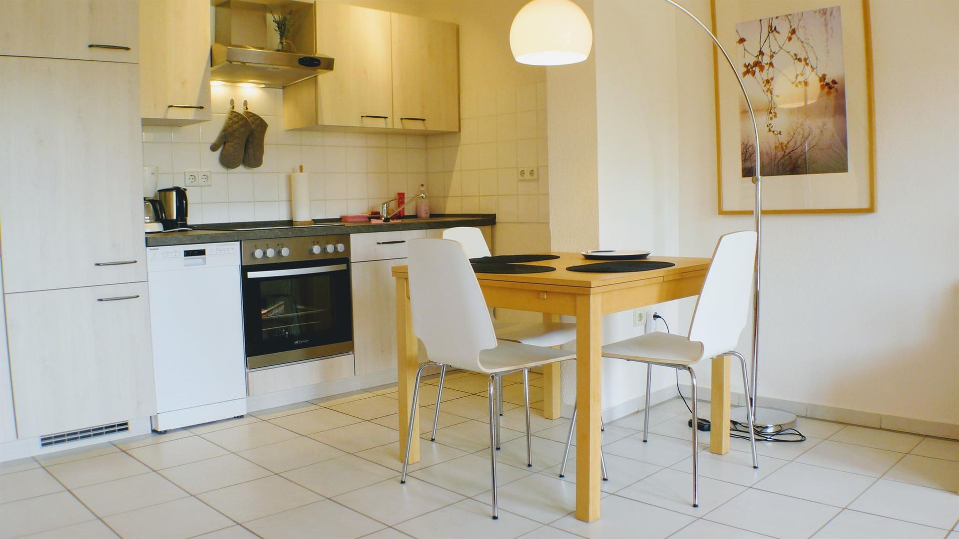 Die Ferienwohnung verfügt über die komplette Ausstattung: Neue Küche incl. Spülmaschine, Toaster, Kaffeemaschine, Mixer, Heißwasserbereiter, Vierer-Kochfeld, Backofen, Microwelle, Kühlschrank mit Gefrierfach etc. Das Wohnzimmer ist mit Flachbildschirm, Stereoanlage, DVD-Player, Kabelfernsehen, einer kleinen DVD-Sammlung, Spielesammlung und Bibliothek ausgestattet. Schnelles WLAN/Internet und Telefon im deutschen Festnetz steht den Gästen kostenlos zur Verfügung.