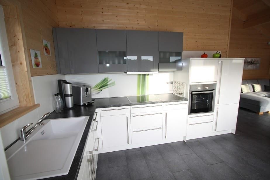 Der Wohnraum unterteilt sich in die Bereiche Küche, Essecke, Wohnecke.